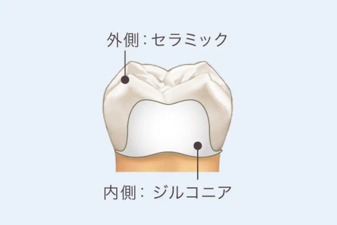 内側には、強度の高さから「人工ダイヤモンド」とも呼ばれるジルコニアを使用し、外側には自然な白さと透明感が魅力のセラミックを重ねた被せ物です(ジルコニアのみで仕上げるタイプもあります)。